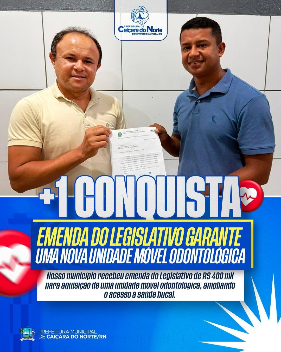 Caiçara do Norte segue avançando na área da saúde.Nosso município foi contemplado com uma emenda parlamentar no valor de R$ 400 mil, destinada à aquisição de uma unidade móvel odontológica, que irá ampliar e facilitar o acesso da população aos serviços de saúde bucal.